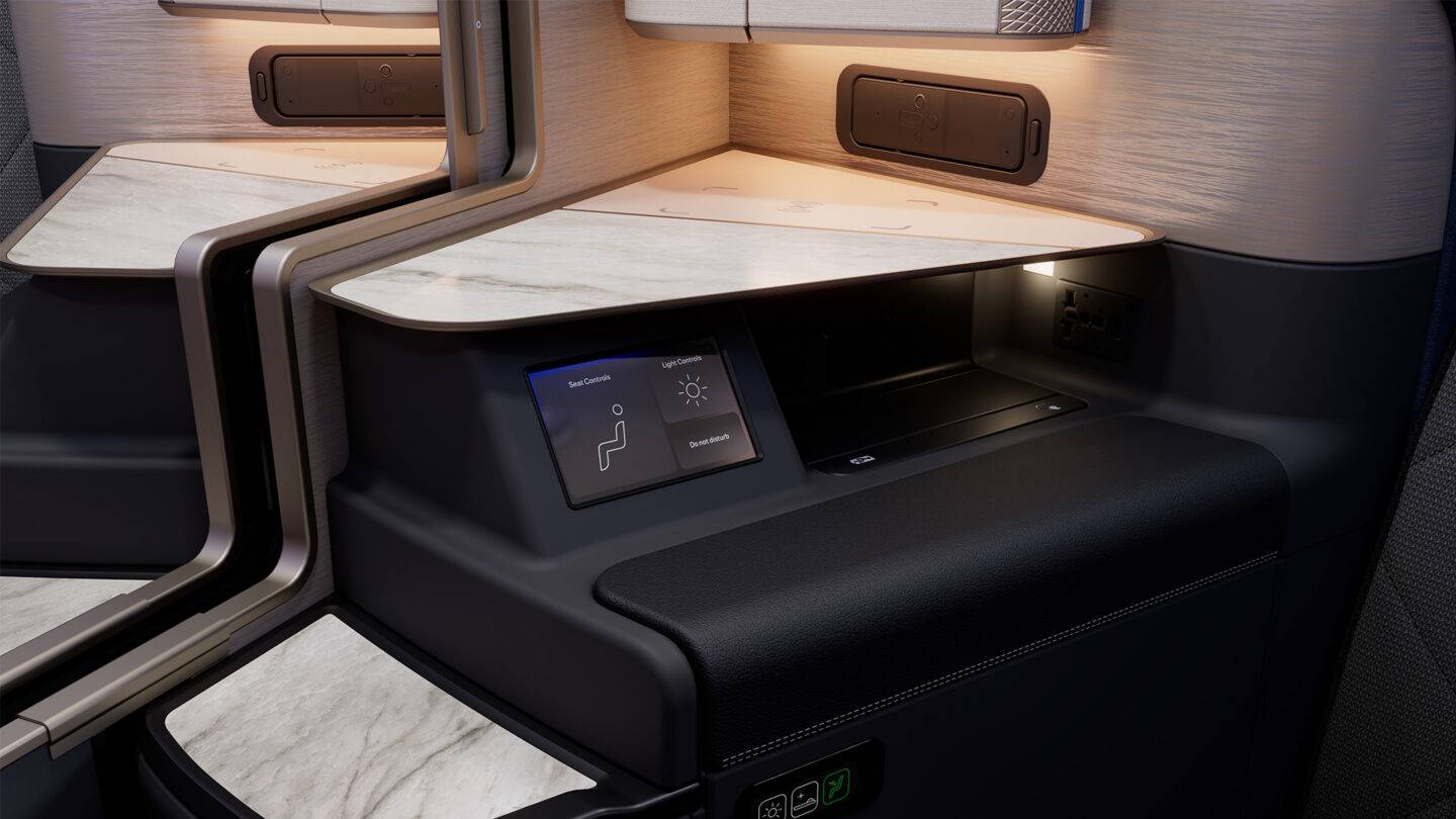 Eight United Polaris Studio suites offer 25% more space, with the front rows of each cabin conceived as a range of distinct experiences. From spacious individual retreats to open co-travelling seats that transition into a generous double bed. The suites are elevated in material quality, incorporating 27″ monitors set behind large Quartzite table surfaces, and wall-mounted lamps synchronised to the seat control screen for a boutique, hotel-like atmosphere.