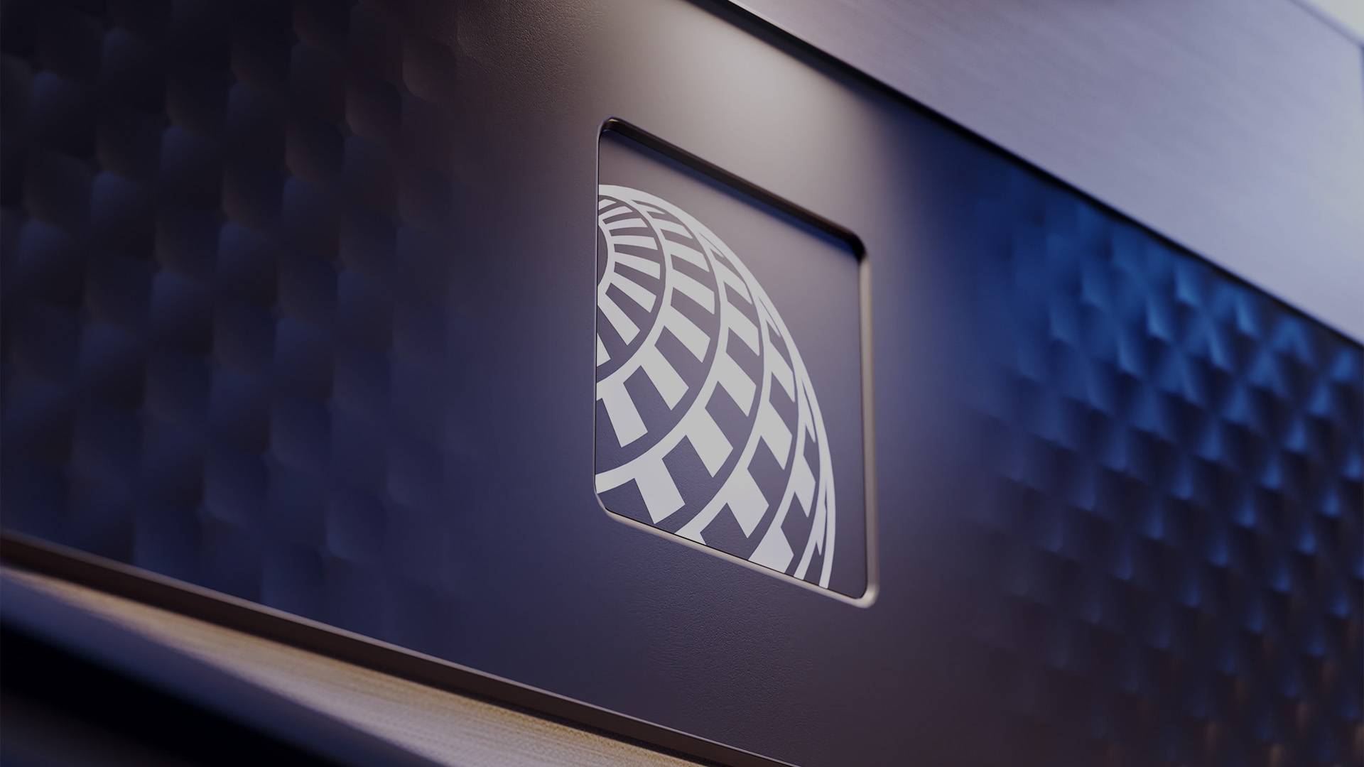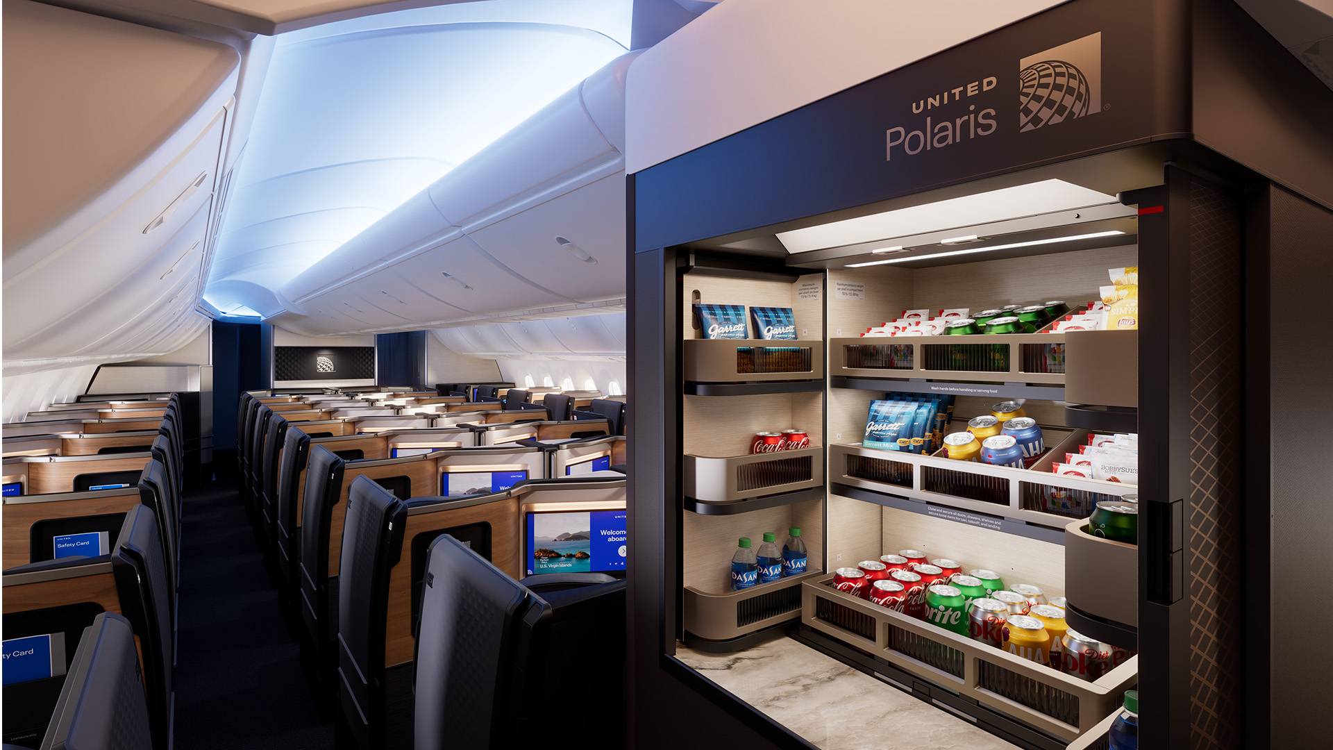 A new self-service snack bar carved out within the Polaris cabin provides a branded, walk-up welcome area that opens to reveal a real stone-lined display illuminated with warm LED lighting. Exterior doors carry a double-swoop pattern abstracted from the arc of the United globe, an intricate detail that ties the service space back to the airline’s own identity.