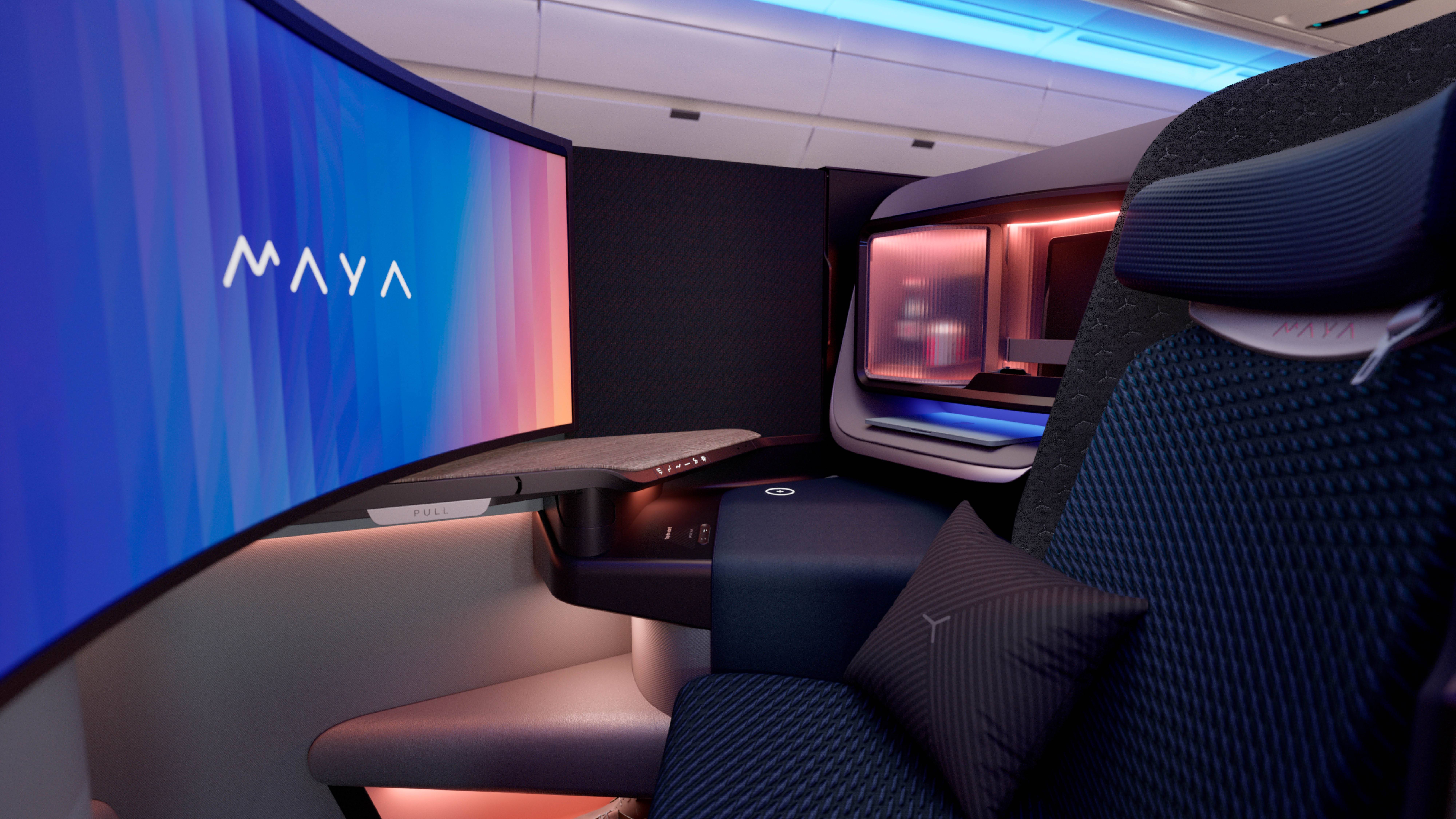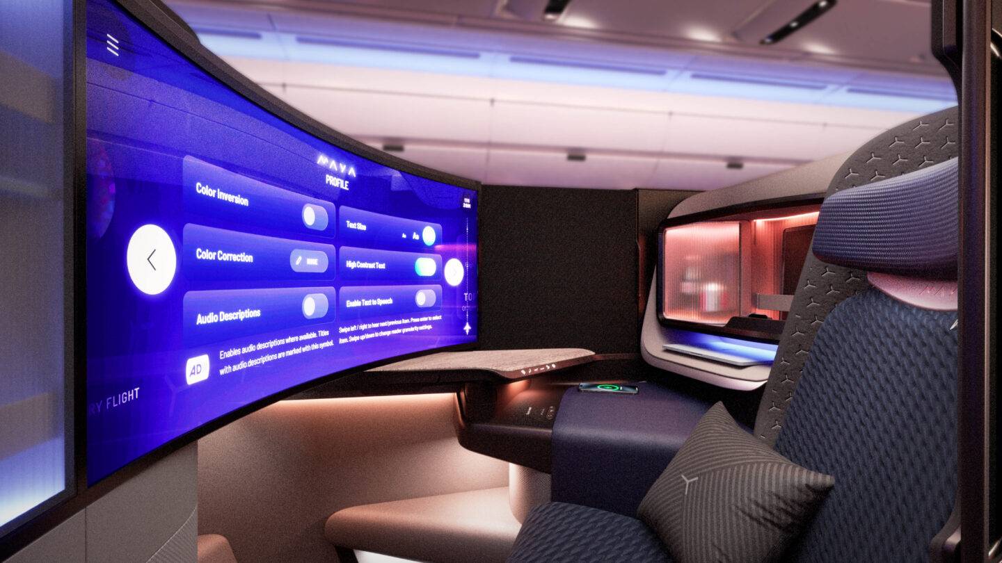 In essence, Shy Tech moves away from “technology for technology’s sake” towards a more human centred approach that ensures digital tools are supportive of independence, rather than a barrier. One of the most promising aspects of Shy Tech is its potential to actively support passenger wellbeing across the full spectrum of human needs. At PriestmanGoode, wellbeing means creating spaces that are inclusive of passengers’ diverse needs. MAYA (Most Advanced Yet Achievable), is a next-generation business class suite and PriestmanGoode’s clearest expression of what Shy Tech can achieve when inclusion is treated as a design requirement, not an afterthought.